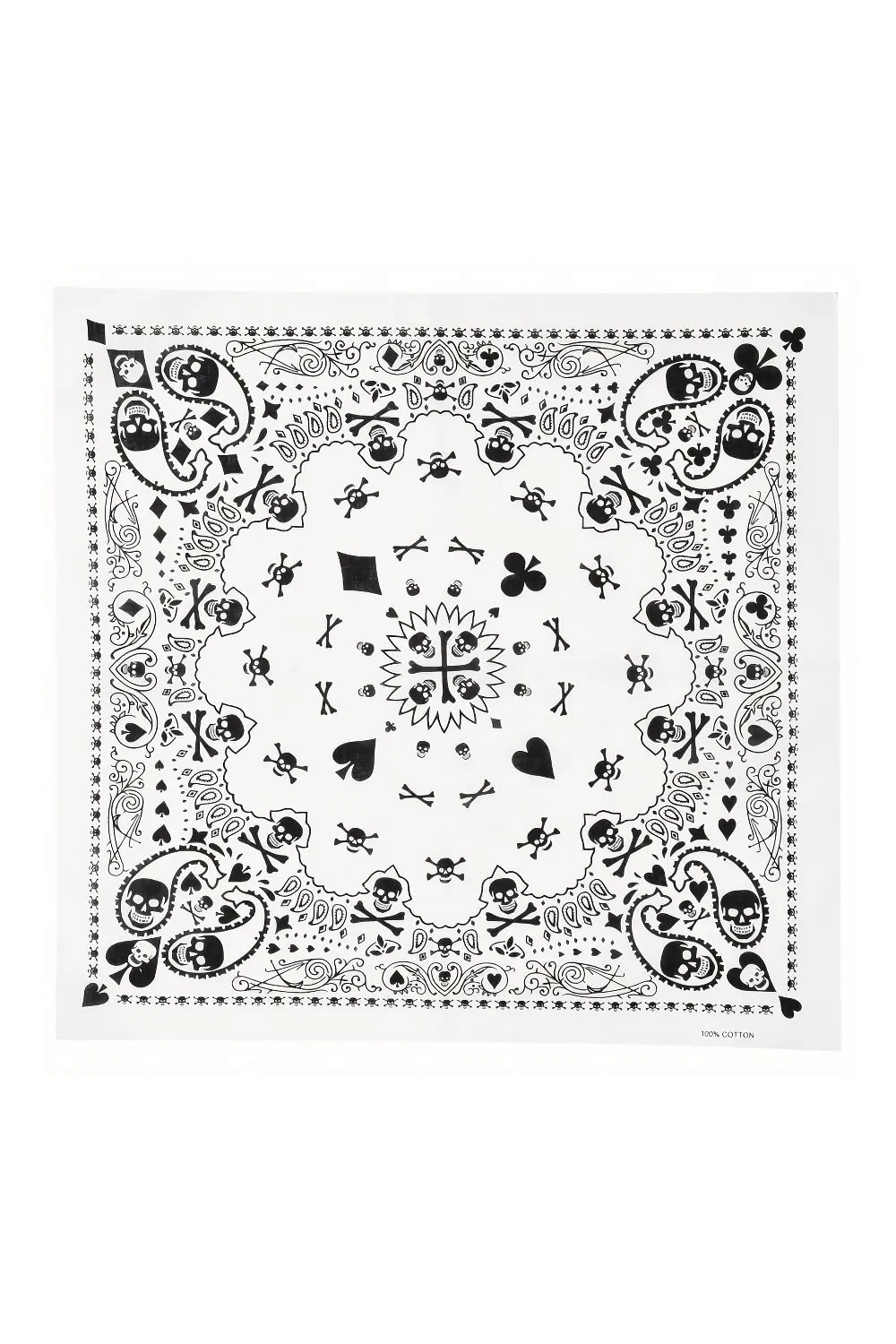 Бавовняна бандана-хустка з принтом "черепи" карти. Розмір 55 на 55 см (похибка 2см.). Має близько 10 способів зав’язування на голову, шию, руки та ноги. Є важливим елементом різних субкультур. Завдяки якісній матерії захищає від сонця та пилу. Також використовується на кухні як захист від потрапляння волосся. Може декорувати різні аксесуари та транспортні засоби.