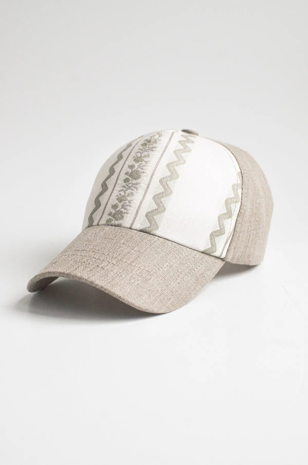 Бейсболка льняна форхед з етно логотипом. Дуже якісне пошиття виробу. Фронтальна частина бейсболки має жорстку, характерну клиновидну форму. Регулятор — металева застібка.