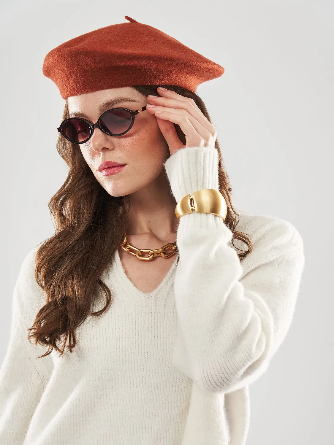 Однотонний вовняний берет класичного покрою, виконаний зі шільної та приємної на дотик вовни. Згори характерна антенка для зручного знімання. Має прихований шов та носиться будь-якою стороною. Незамінний атрибут для поціновувачів класики. Вовняна структура захищає від вітру весною та восени і зігріває взимку. Носиться з пальто, куртками та плащами.