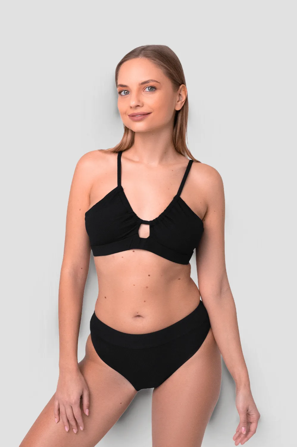 Купальник роздільний топом-трикутником в рубчик. Має зйомні бретелі, що дають можливість зав’язуватися на шию. Ліф має поролонові вставки, що виймаються. Об’єм на зав’язку. Плавки вищої посадки. Матеріал еластичний та приємний до тіла.