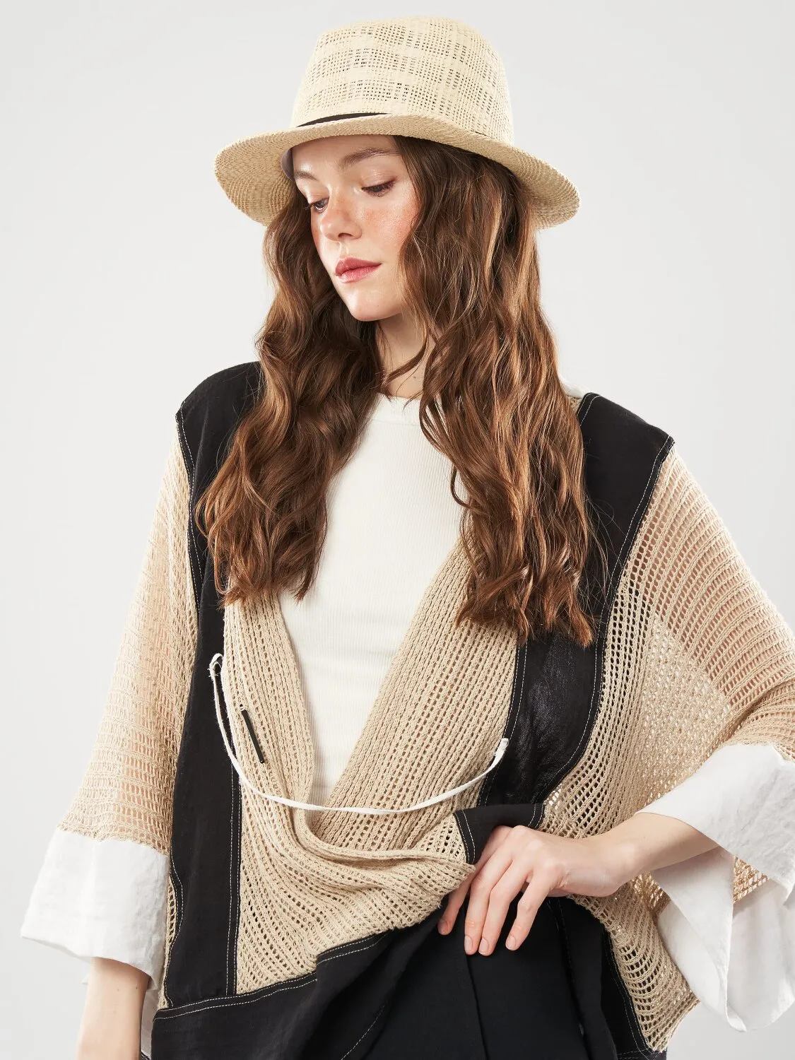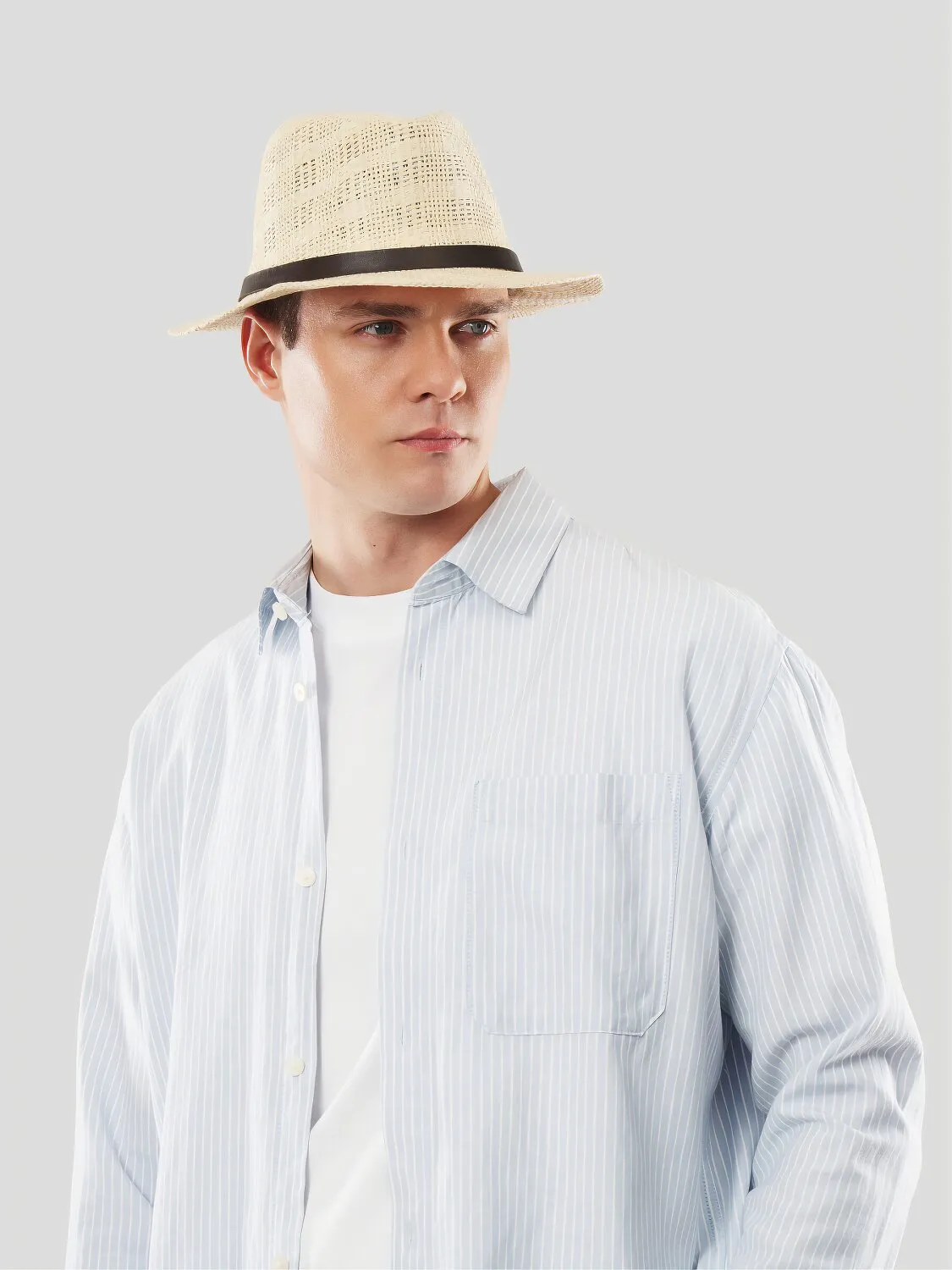 Капелюх Федора з прямими полями та коричневим обідком. Всередині є підкладка, що надає характерну форму. Регулювання розміру — стяжка. Рекомендується як елемент щоденного стилю так і для довершення модного образу. Ідеальне рішення для відпочинку.