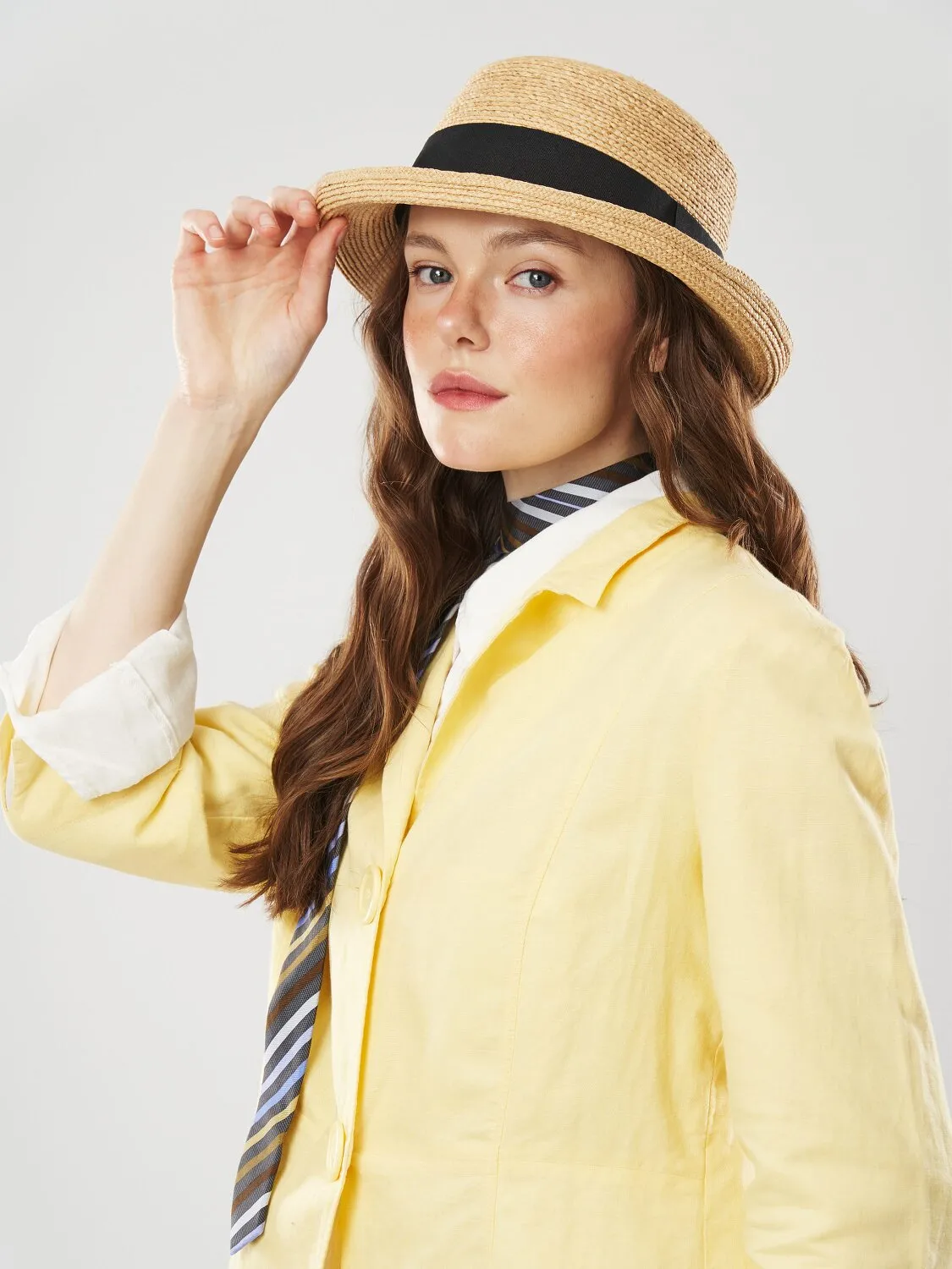 Капелюх канотьє з зігнутими вгору полями. Має середні поля та тулію з плоским верхом. Має шнурівки для фіксації на шиї. Зроблений з дихаючої матерії з захистом від ультрафіолету. Всередині є регулятор — липучка. Ідеальне рішення для довершення пляжного образу, відпочинку та підійде для прогулянок та щоденного носіння. Догляд - вологою губкою з додавання делікатного плину при потребі.
