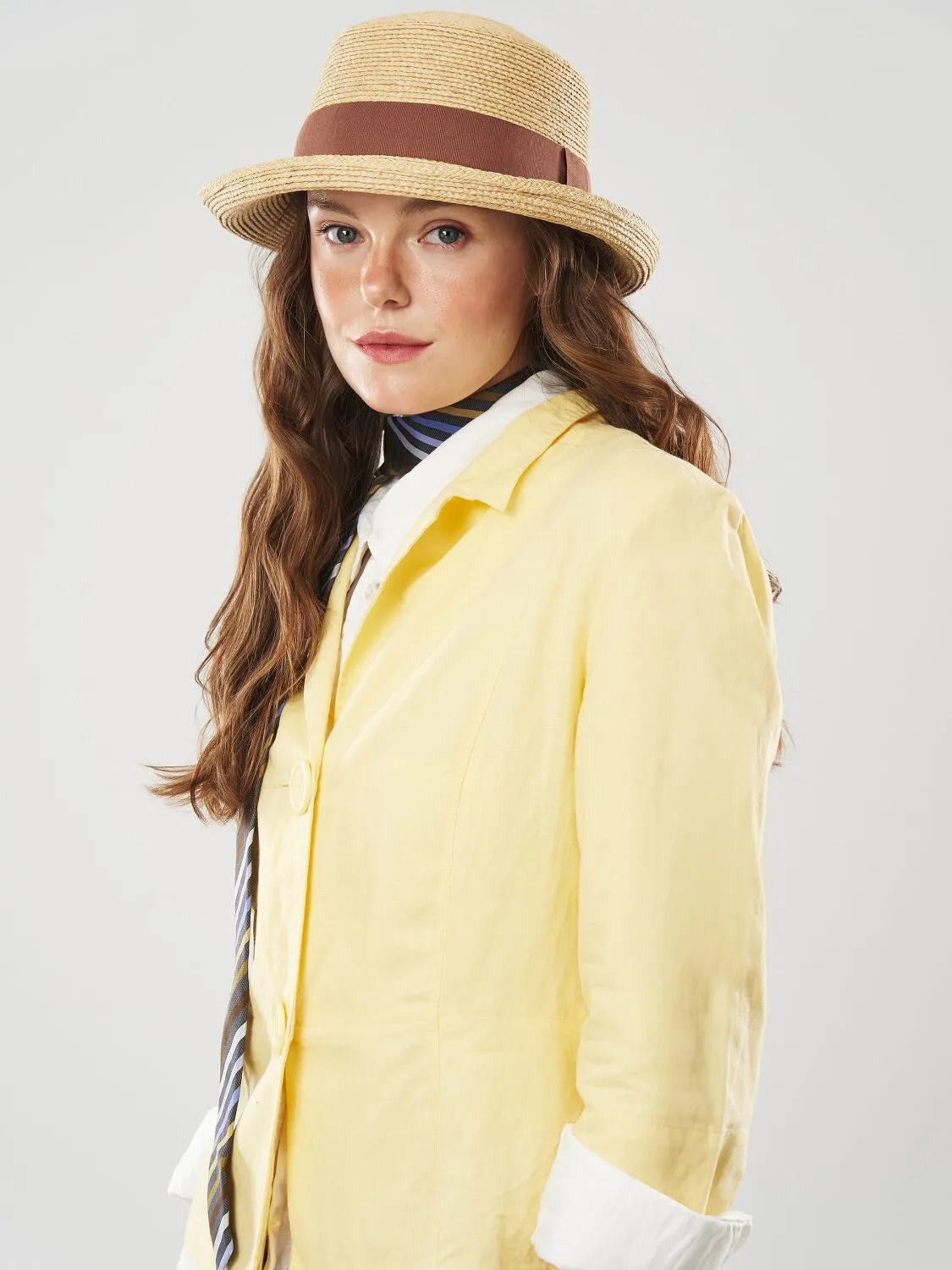 Капелюх канотьє з зігнутими вгору полями. Має середні поля та тулію з плоским верхом. Має шнурівки для фіксації на шиї. Зроблений з дихаючої матерії з захистом від ультрафіолету. Всередині є регулятор — липучка. Ідеальне рішення для довершення пляжного образу, відпочинку та підійде для прогулянок та щоденного носіння. Догляд - вологою губкою з додавання делікатного плину при потребі.