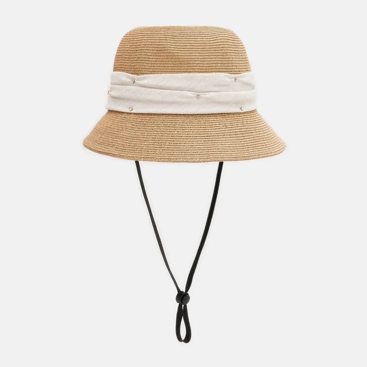 Жіночий капелюх клош з широкими полями та стразами. Всередині є регулятор — липучка. Має шнурівки для носінняна шиї. Зроблений з дихаючої матерії з захистом від ультрафіолету. Капелюх можна складати як панаму для зручного перевезення. Рекомендується як елемент щоденного стилю так і для довершення модного образу. Ідеальне рішення для відпочинку. Догляд - вологою губкою з додавання делікатного плину при потребі.