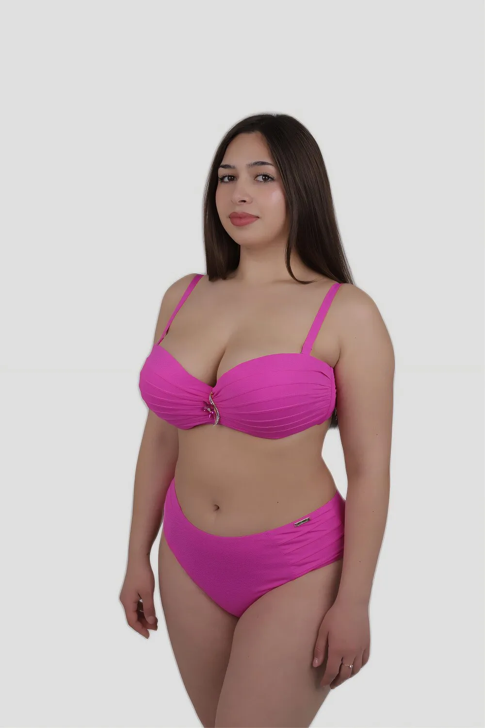Купальник роздільний анжелікою з декорованою чашкою та брошкою посередині. Ліф без Push-up з регульованими бретелями. Об’єм фіксується металевою застібкою. Плавки — сліпи середньої посадки, з тканинним декором по бокам. Гігієнічна підкладка вздовж всього купальника. Матеріал якісний, еластичний та приємний до тіла.