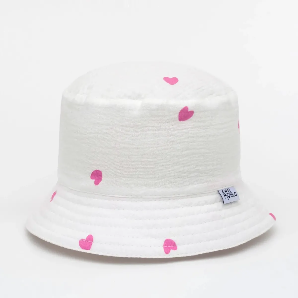 Літня муслінова панама з принтом рожеві сердечка. Якісний матеріал захищає від сонячних променів і забезпечує обіг повітря для запобіганню запотівання. Рекомомендуємо на вік від 9 місяців до 1.5 роки.