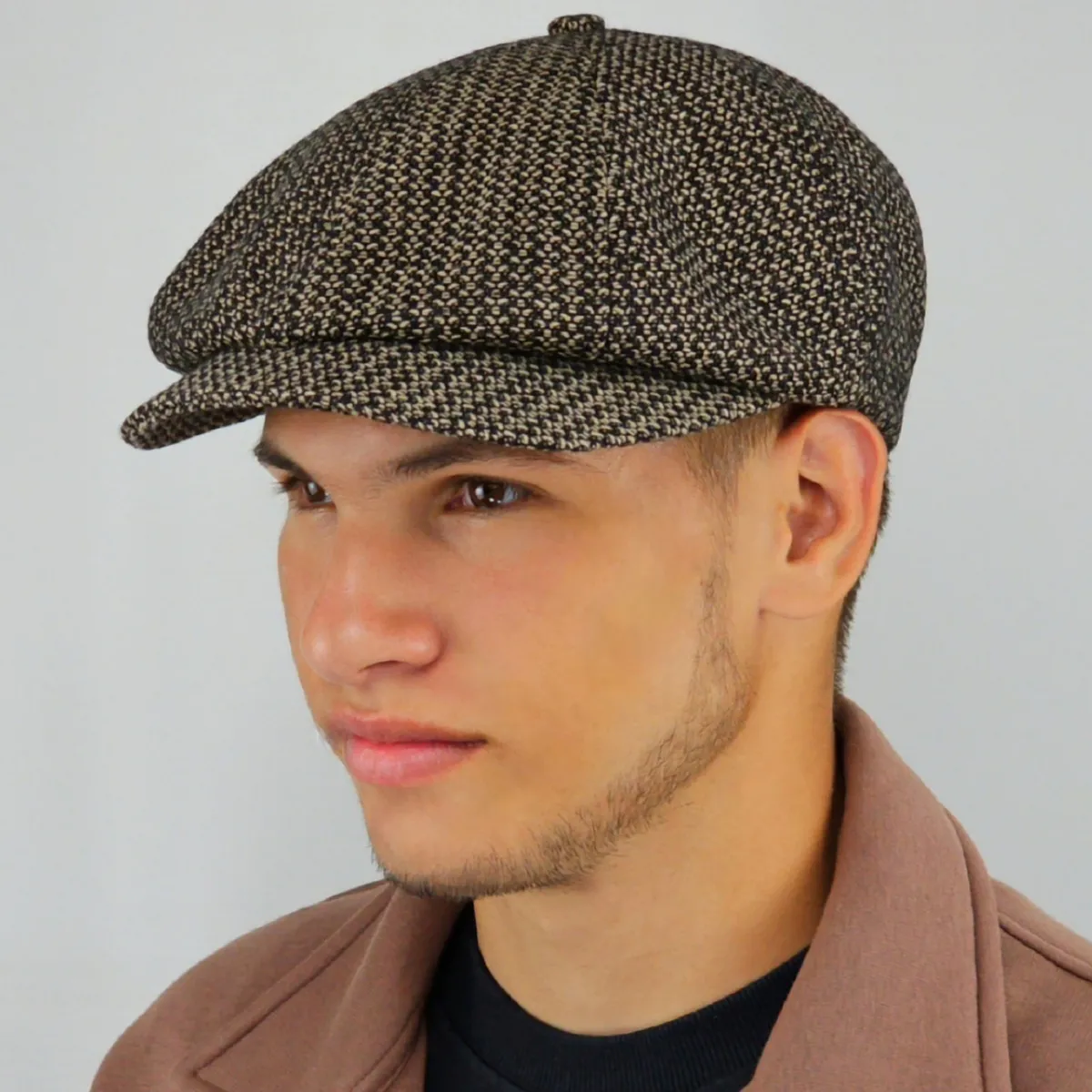 Демисезонная кепка восьмиклинка хулиганка шерстяная с удлиненным козырьком и напусками по бокам. Практичный цвет и принт позволяют носить практически со всем гардеробом. Рекомендуется на весну и осень.