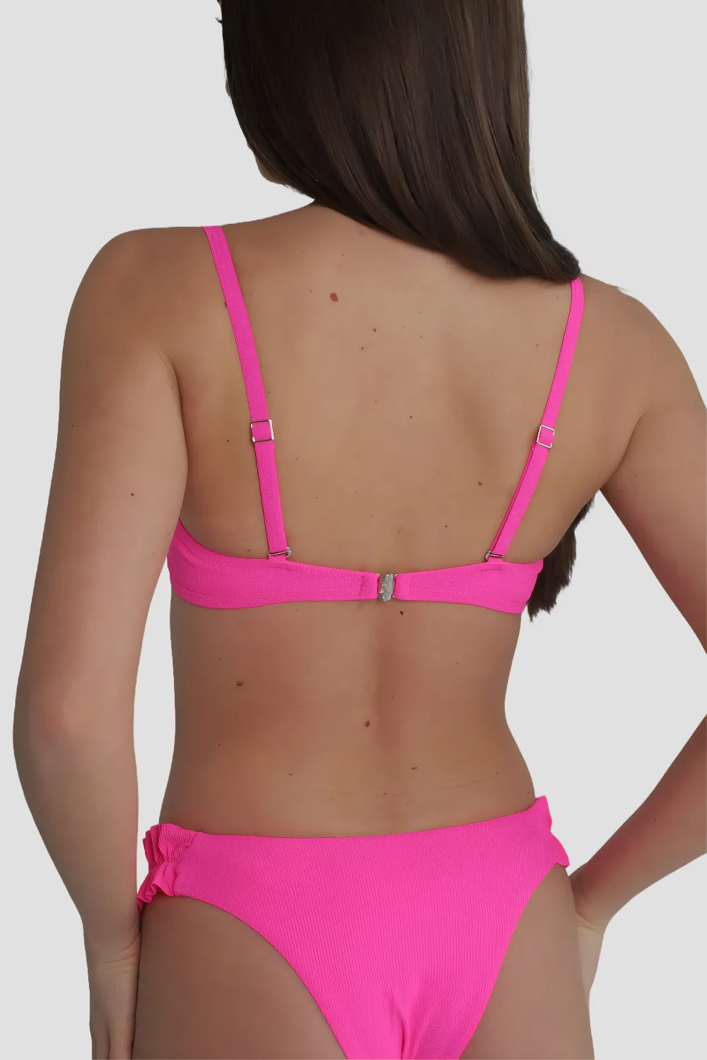 Раздельный купальник анжелика с регулируемыми бретелями на застёжку. Лиф с фактурного материала — жатка с рюшками поролоновой чашкой без Push-up. Плавки - ласточки с декорируемыми вставками на бедрах. Материал эластичный и приятный на ощупь.