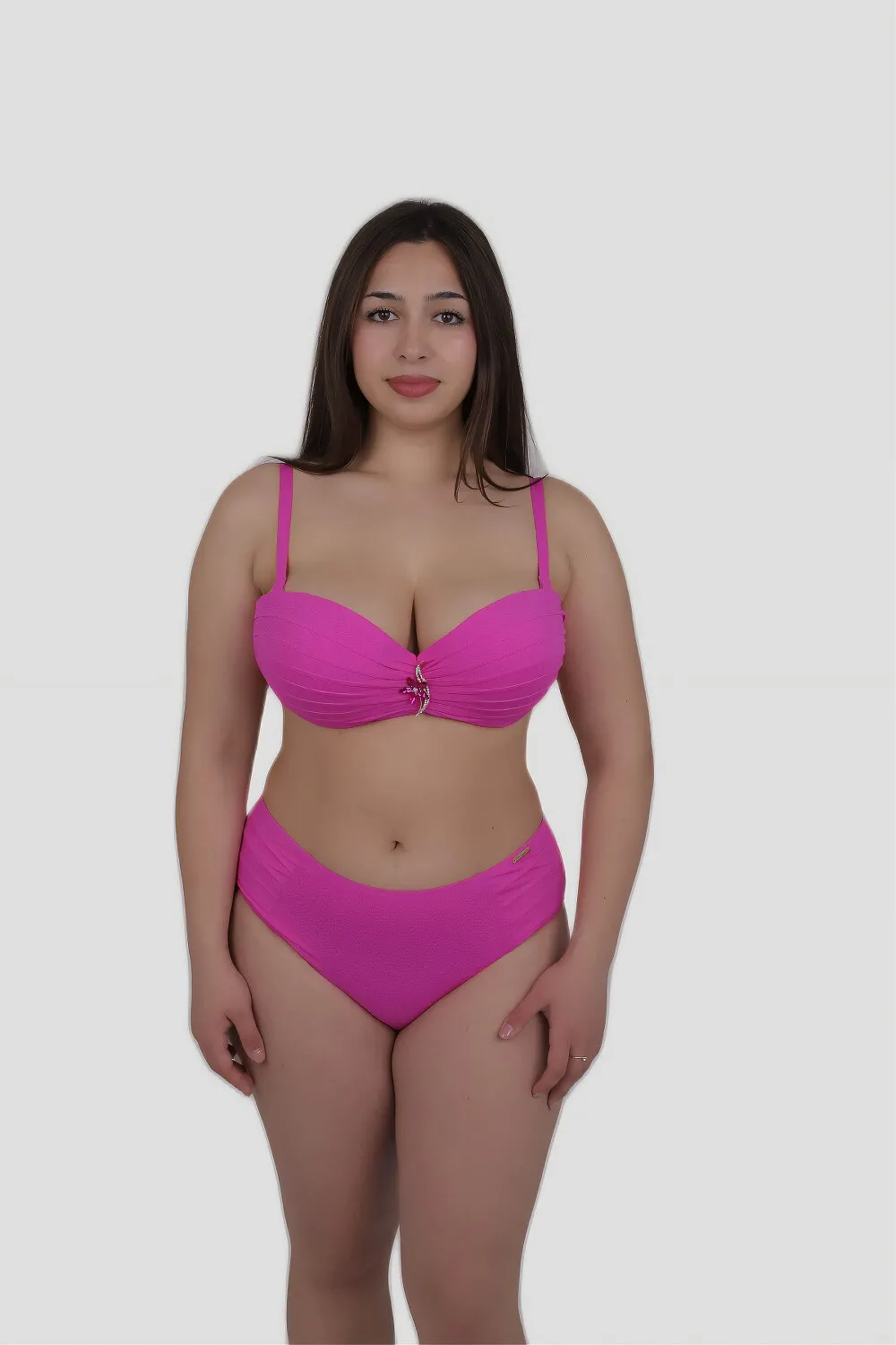 Купальник раздельный анжеликой с декорированой чашкой и брошкой посредине. Лиф без Push-up с регулируемыми бретелями. Объем фиксируется металлической застёжкой. Плавки — слипы средней посадки, с тканевым декором по бокам. Гигиеническая подкладка вдоль всего купальника. Материал качественный и приятный на ощупь.