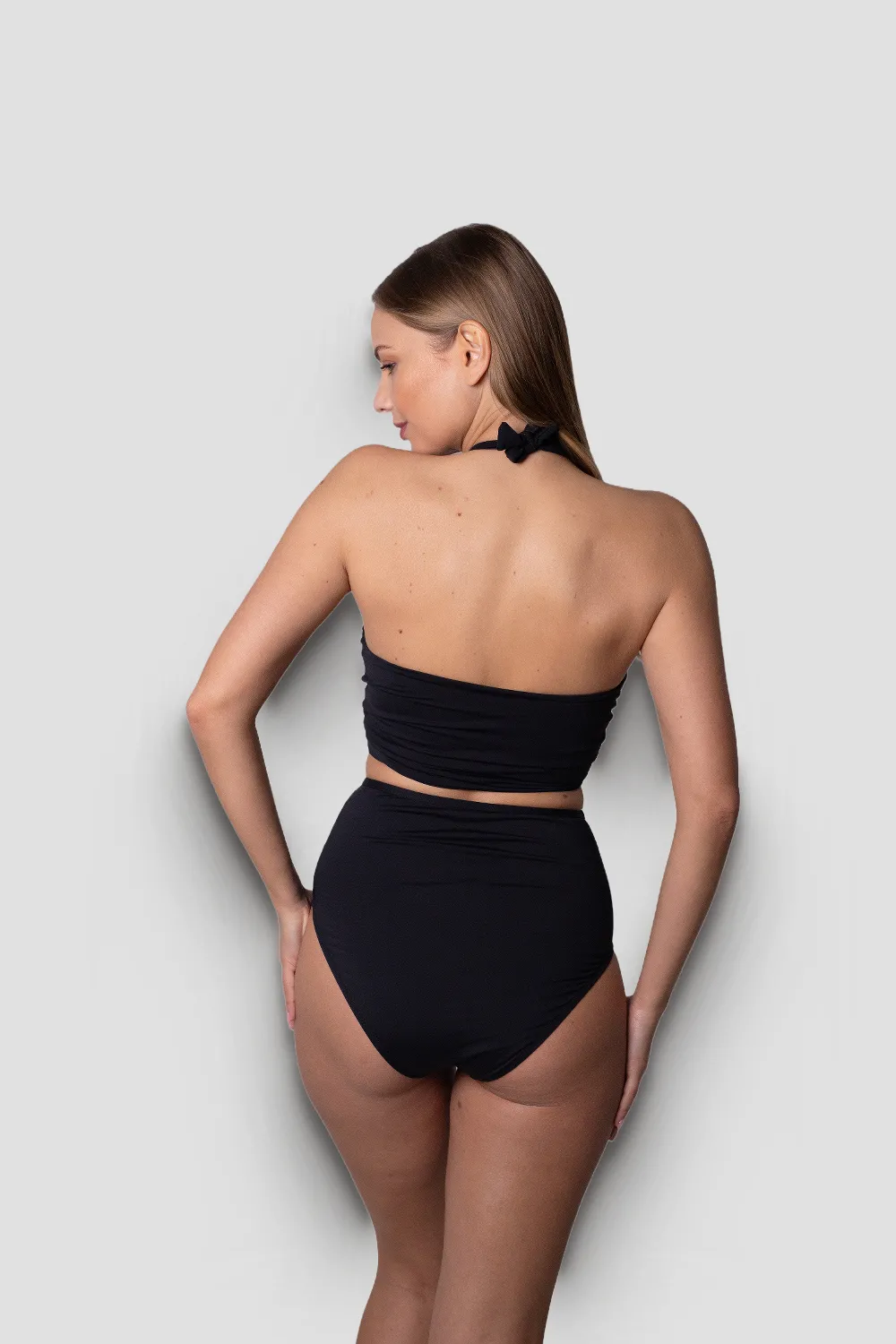 Купальник раздельный с лифом-бандо с полосками накрест, которые завязываются на шее. Полоски без поролоновых вставок. Плавки — высокой посадки, с сеткой сверху. Гигиеническая подкладка вдоль всего купальника. Материал чрезвычайно качаственный, эластичный и приятный на ощупь.