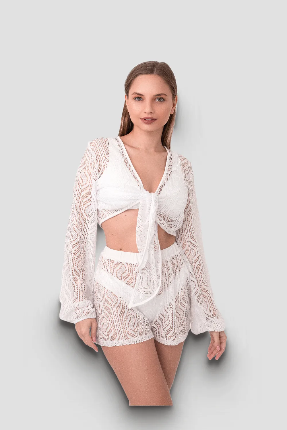 Пляжный комплект с ажурной ткани. Болеро на завязку спереди. Шорты прямого кроя и имеют удобную резинку на талии. Материал чрезвычайно качественный и приятный на ощупь.