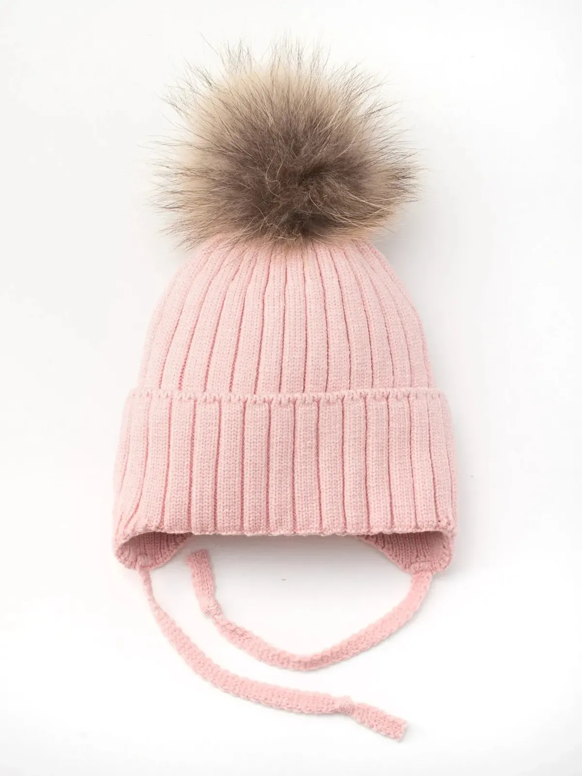 Шапка в’язана в рубчик на зав'язки з натуральним єнотовим помпоном на флісовій підкладці з манжетом Glory Kids 46-48 Пудровий 5008