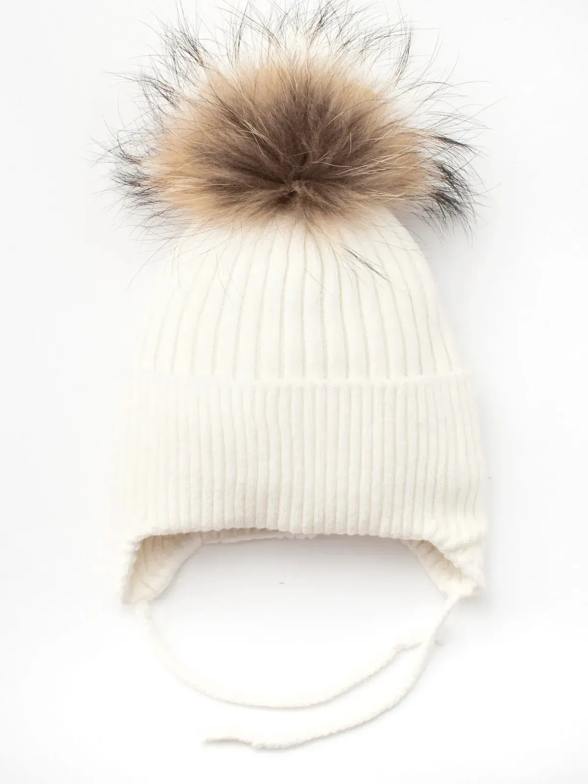 Шапка в’язана в рубчик на зав’язки з натуральним єнотовим помпоном на флісовій підкладці з манжетом Glory Kids 48-50 Молочний 5009