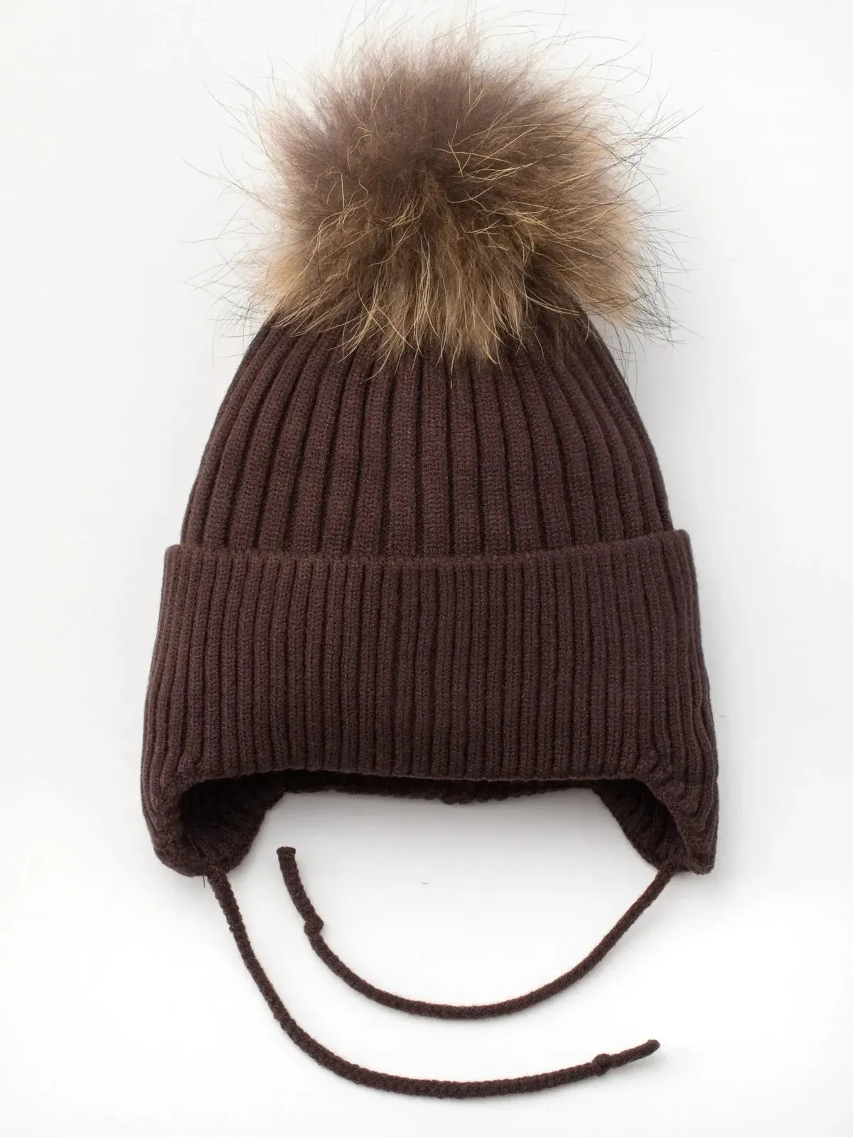 Шапка в’язана в рубчик на зав’язки з натуральним єнотовим помпоном на флісовій підкладці з манжетом Glory Kids 48-50 Темний шоколад 5009